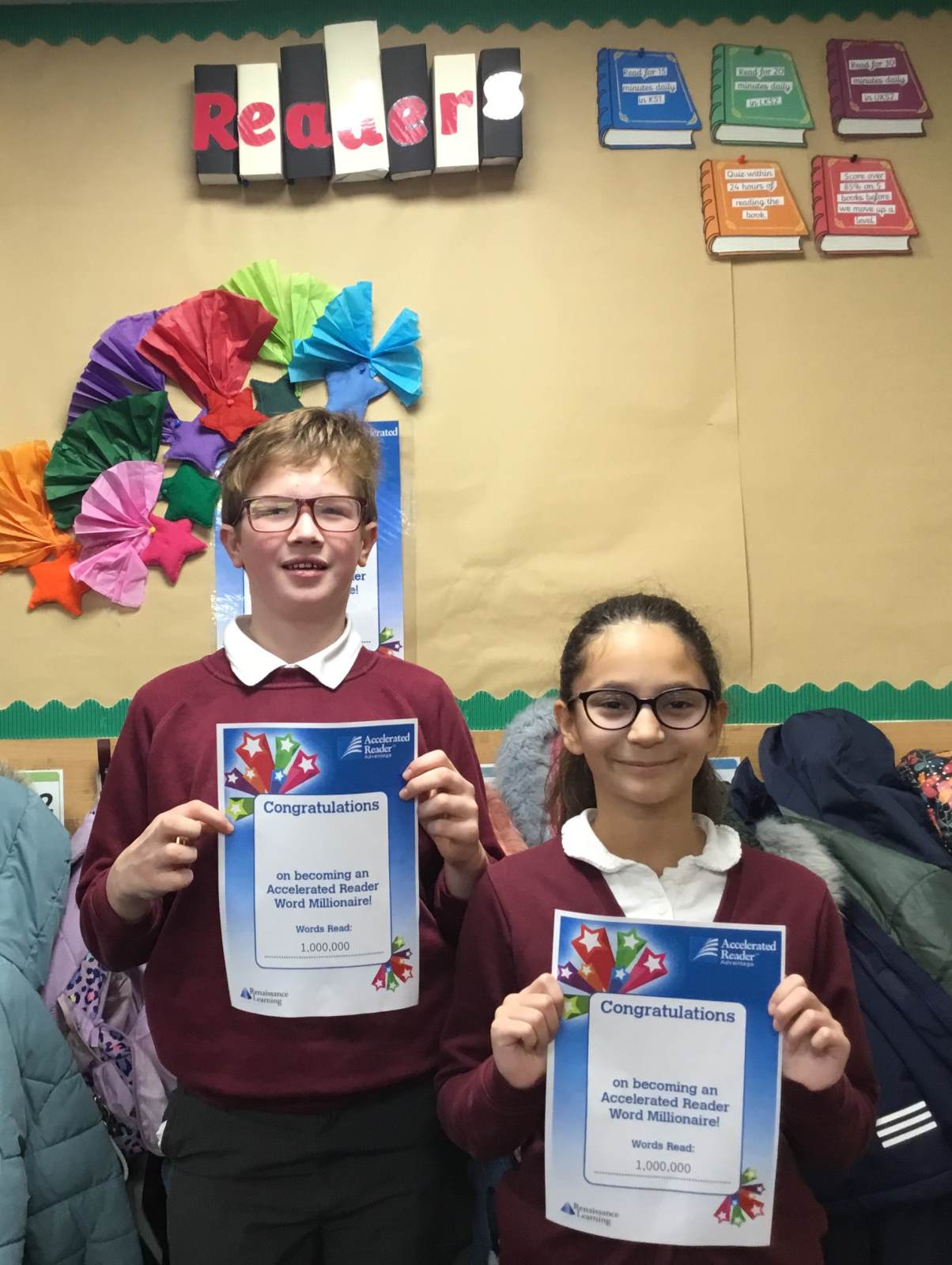 Awards in assembly. Two of our Year 6 children, were awarded certificates today. They are our first millionaire readers for this year. Congratulations.