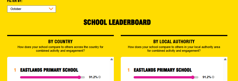 | Congratulations to Year 2 for being top across school at the end of October! 98% of 540 total possible trips recorded, 99% of them were active. As a school, we finished 1st in the Country and 1st in our Local Authority! Well done to everyone!