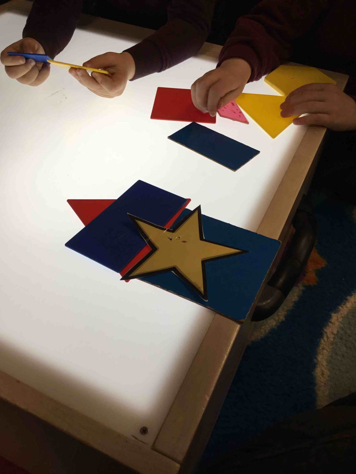 We learnt about prepositional language in Maths and we placed our astronauts in different areas of a spaceship each time. We also explored 2d shapes and made our own space rockets on the light box. We then created our own name rockets, practicing forming the letters of our name.