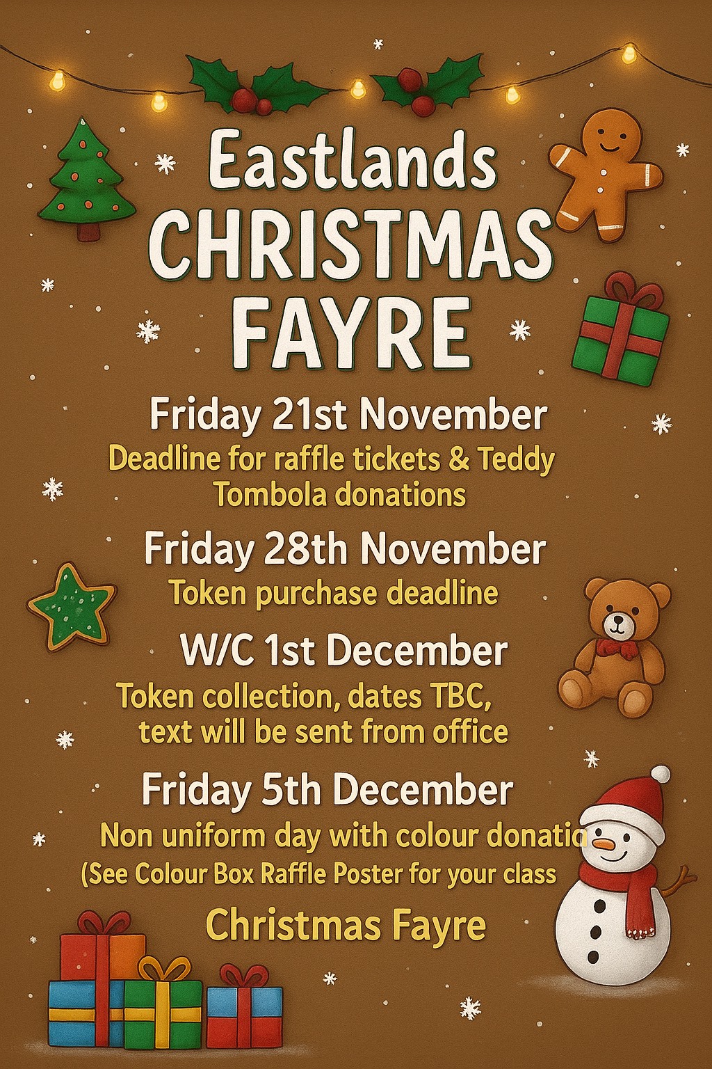 Please see the link to book tokens for the Christmas Fayre:https://eastlands-parent-and-staff-association.sumupstore.com/product/christmas-10-tokens