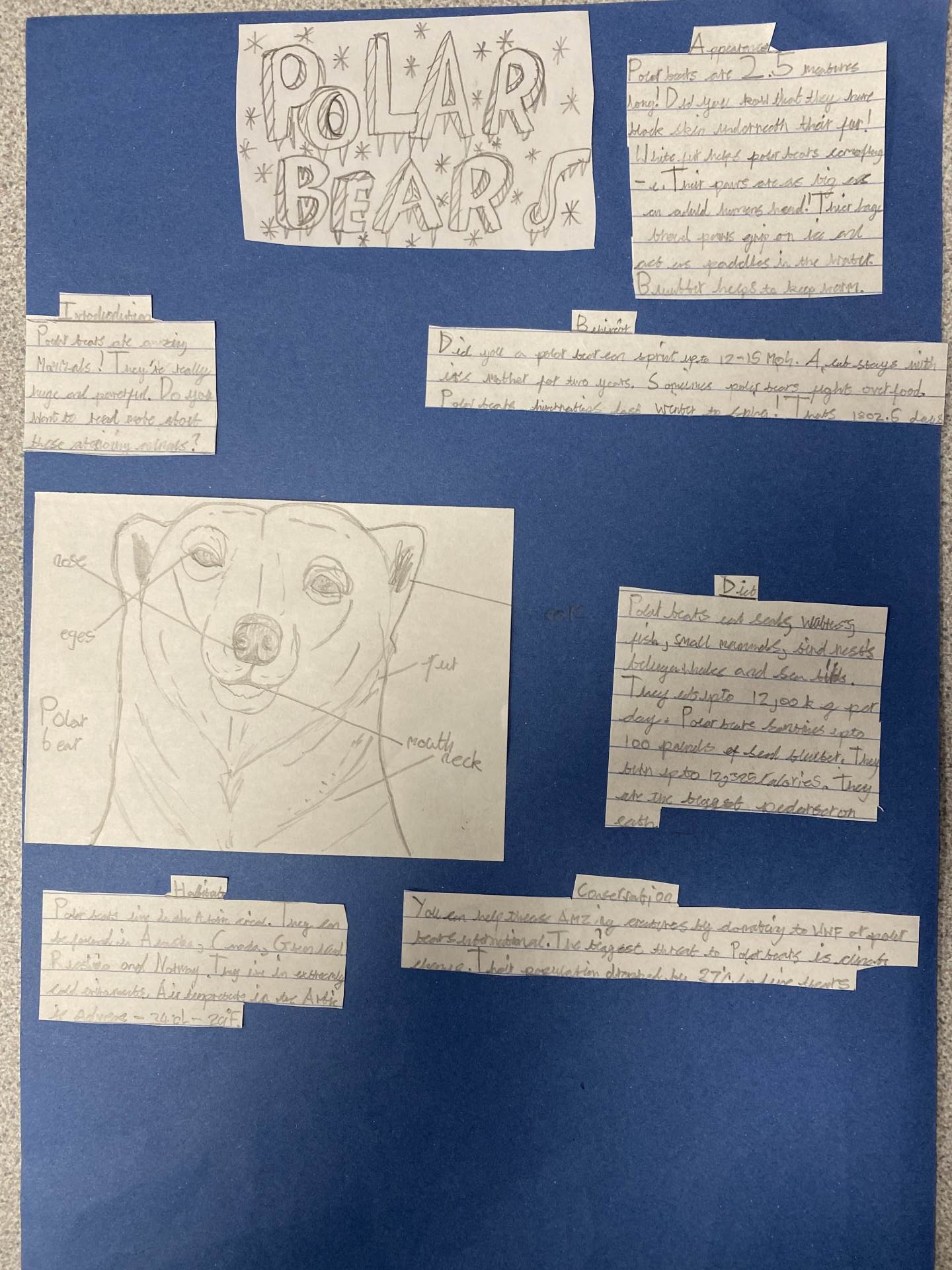 We have now finished writing our non-chronological reports about polar bears and they are fantastic! The children are really enjoying our class book, 'The Last Bear' - it has taught us lots about polar bears and why it is important to look after our planet.