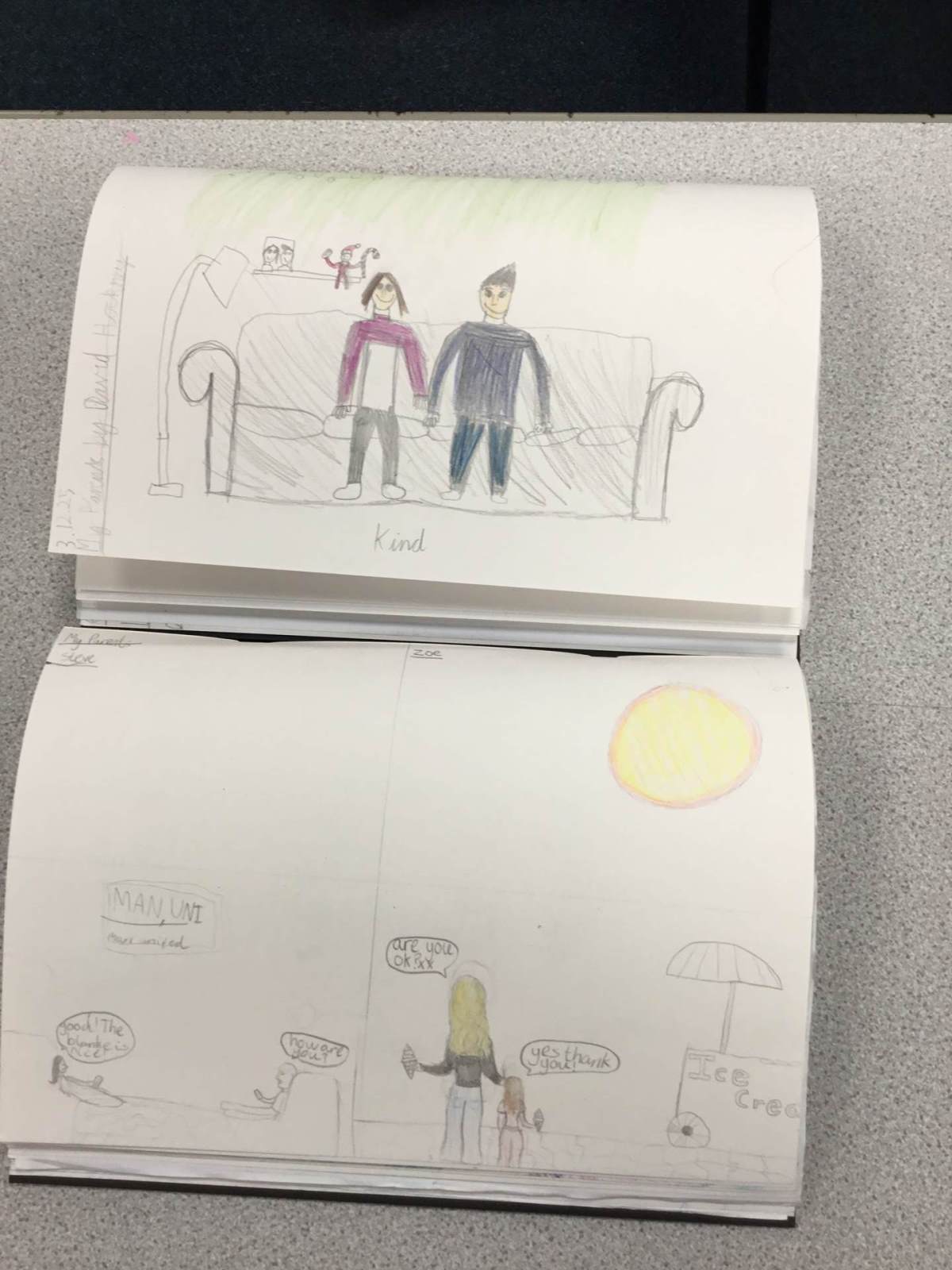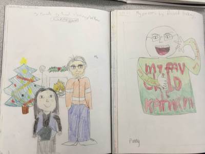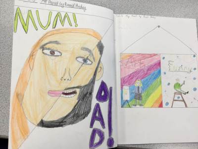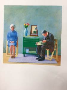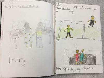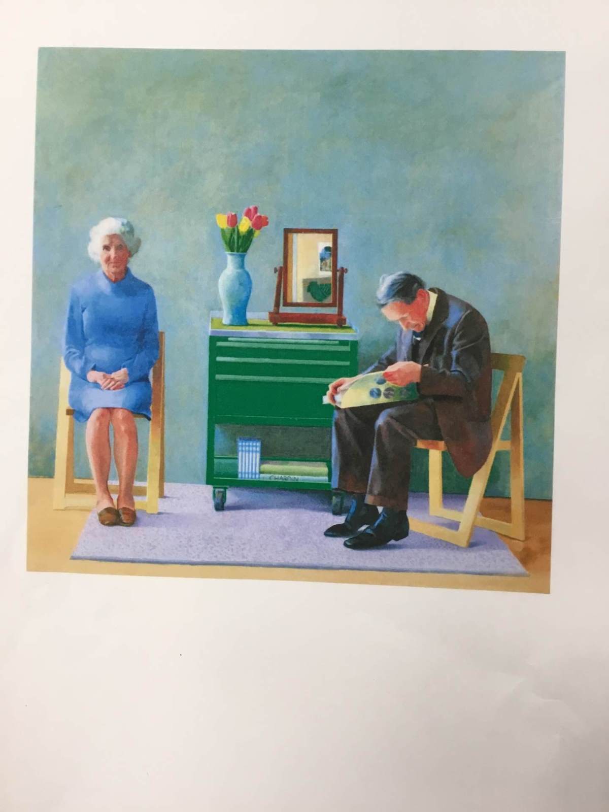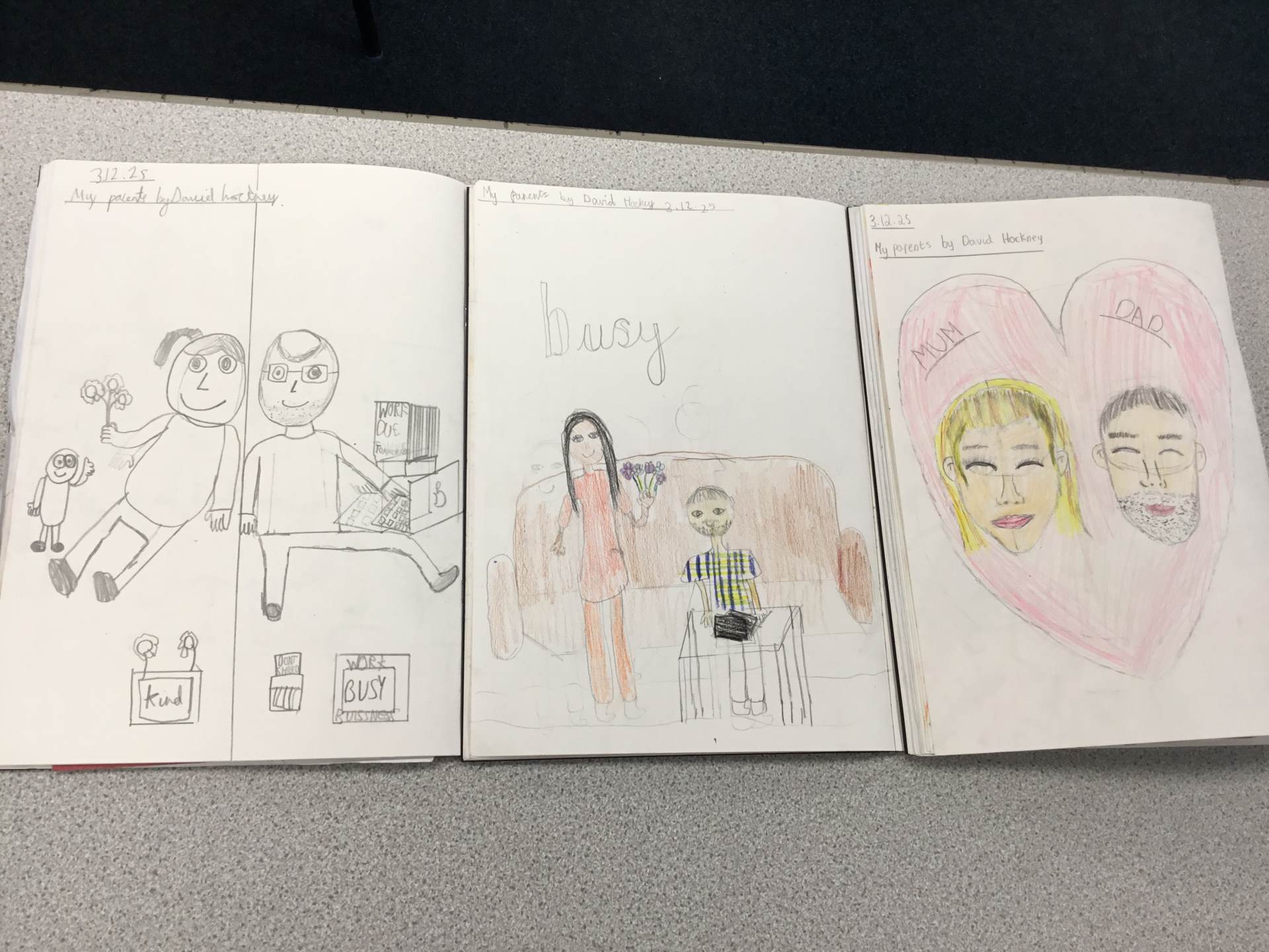 In our art lesson. we looked at David Hockney and his picture - My Parents. We discussed words that represented our Parents and drew them.