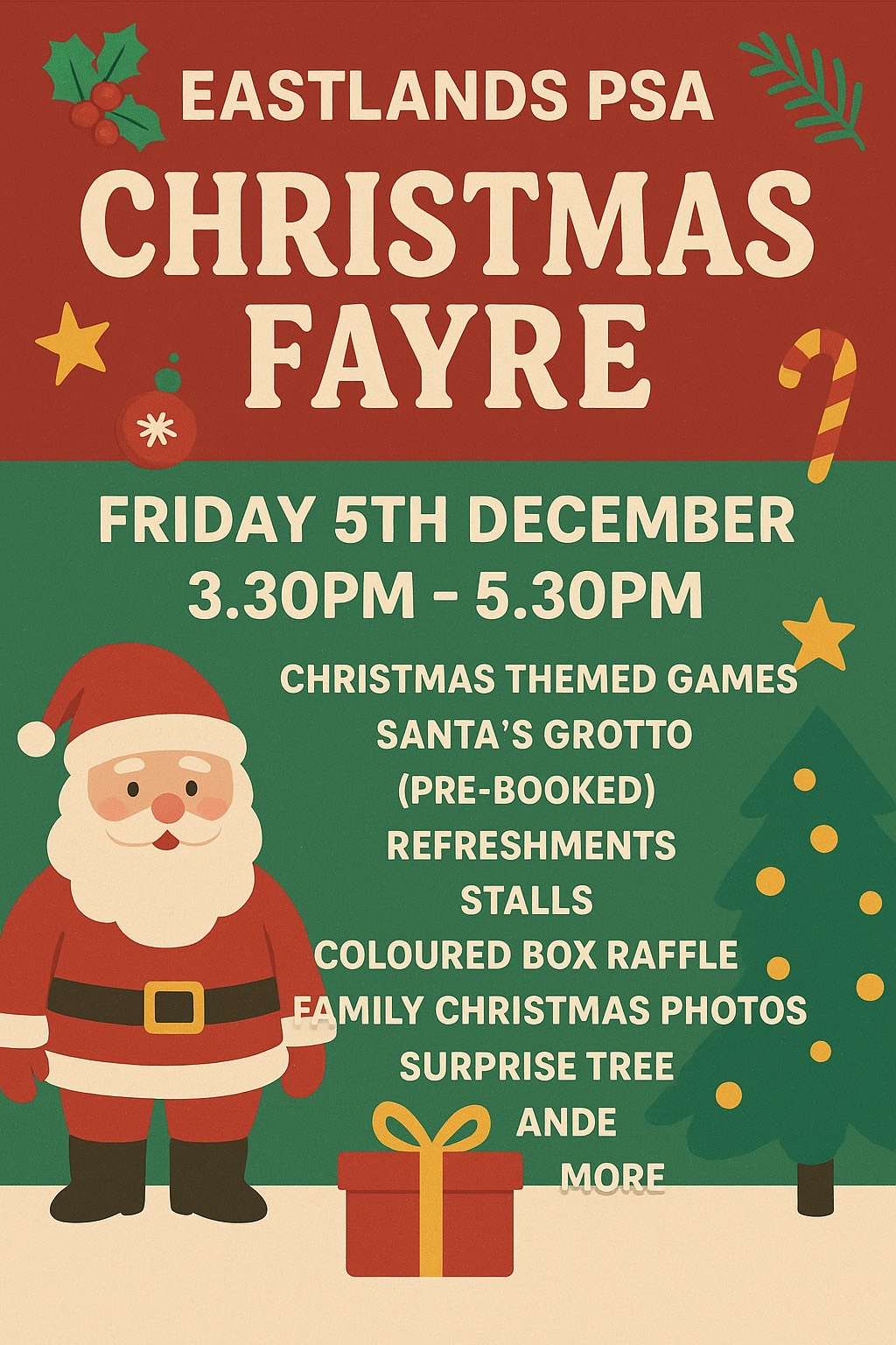 Please see the link to book tokens for the Christmas Fayre:https://eastlands-parent-and-staff-association.sumupstore.com/product/christmas-10-tokens