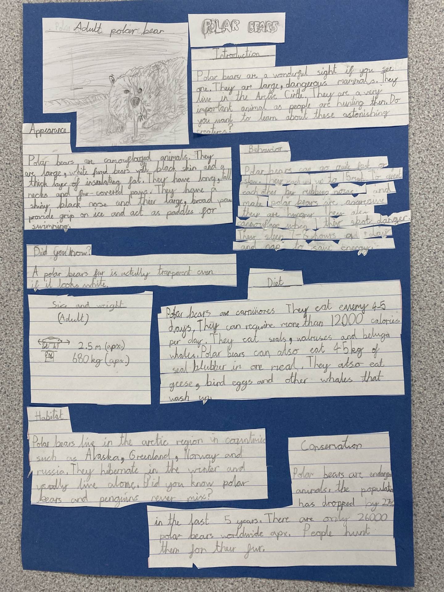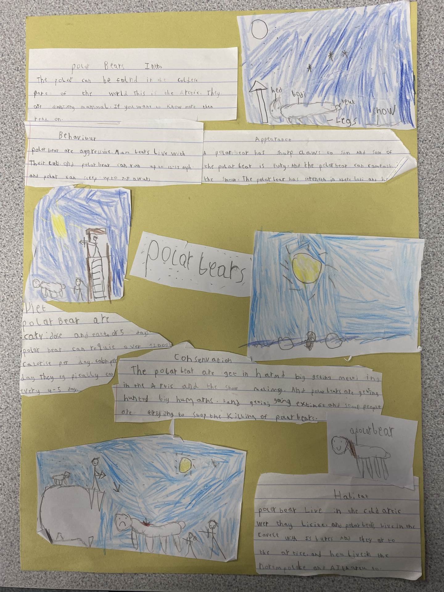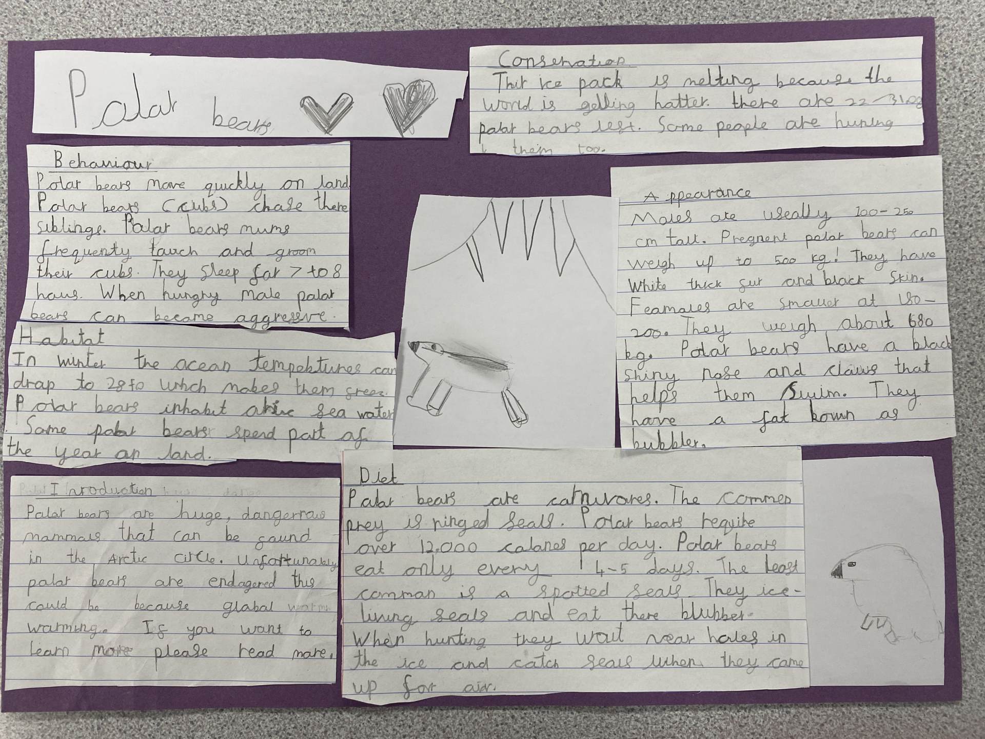 We have now finished writing our non-chronological reports about polar bears and they are fantastic! The children are really enjoying our class book, 'The Last Bear' - it has taught us lots about polar bears and why it is important to look after our planet.